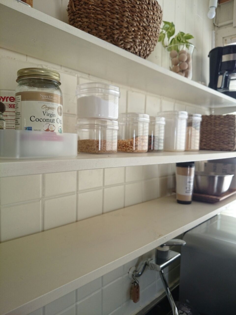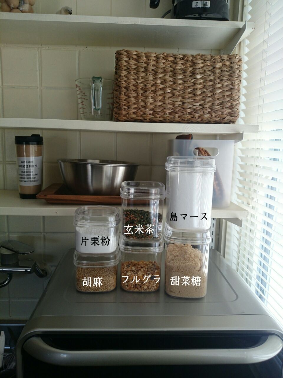 セリアの保存瓶や蓋付きアルミ容器に詰め替えてシンクやコンロ付近に置いて使ってました。